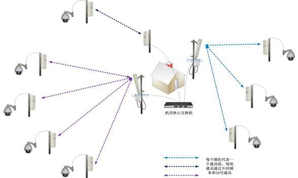 每個(gè)監(jiān)控點(diǎn)采集的視頻信號(hào)用HT-5830F室外天線一體化無線網(wǎng)橋把信號(hào)調(diào)制為微波信號(hào)打到電信網(wǎng)路接入的地點(diǎn)。在該點(diǎn)可以接入多個(gè)終端網(wǎng)絡(luò)信號(hào)并且匯聚。