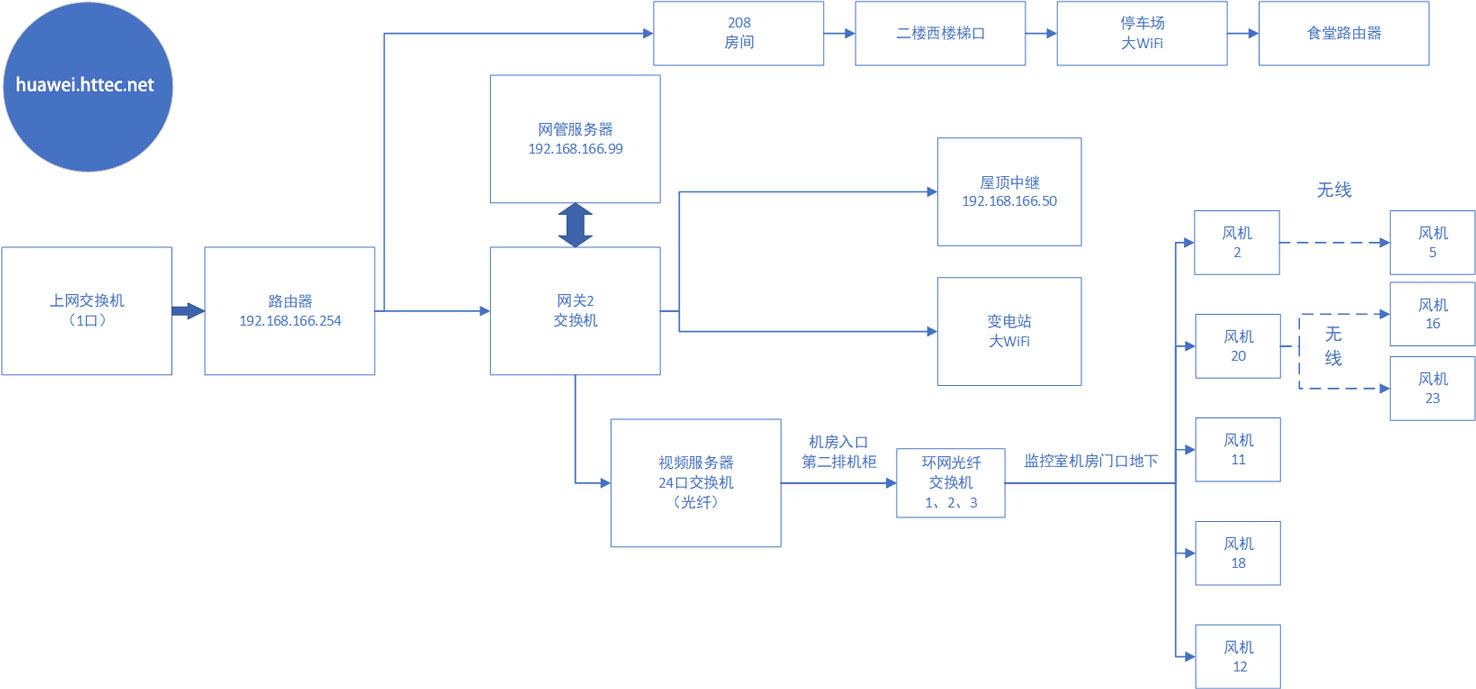 針對(duì)地形起伏大的難點(diǎn),我們通過合理的設(shè)計(jì)將設(shè)備定位在地勢(shì)相對(duì)較高、風(fēng)機(jī)間可視條件較好的幾個(gè)中心風(fēng)機(jī)上,結(jié)合風(fēng)機(jī)自身70m的高度完成無線覆蓋。通過8個(gè)風(fēng)機(jī)將全場(chǎng)的33個(gè)風(fēng)機(jī)包括檢修道路完成無線覆蓋。網(wǎng)絡(luò)拓?fù)淙缦拢?br>