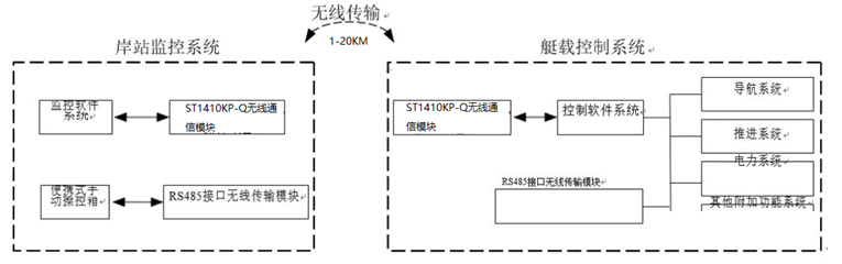 如上圖所示:客戶要求在直徑約10-15KM的大型湖泊內(nèi)對無人艇的視頻數(shù)據(jù)、控制數(shù)據(jù)信號及采集數(shù)據(jù)進(jìn)行穩(wěn)定實(shí)時(shí)的有效傳輸。我方通信工程師與客戶技術(shù)人員進(jìn)行了周密的技術(shù)方案討論,最終選定使用我司針對無人機(jī)械特別研發(fā)的ST1410KP系列設(shè)備作為主要通信設(shè)備,可輕易解決無人艇在高速移動狀態(tài)下穩(wěn)定傳輸?shù)母咔逡曨l信號、采集數(shù)據(jù)信號及雙向控制信號。很好的解決了用戶原有WIFI手段通訊距離近且容易受到干擾的問題。