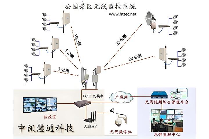 2、中端——無線傳輸設(shè)備:公園、景區(qū)的無線監(jiān)控系統(tǒng)常見的無線傳輸設(shè)備為數(shù)字無線網(wǎng)橋,用于監(jiān)控視頻影像的發(fā)送和接收。
