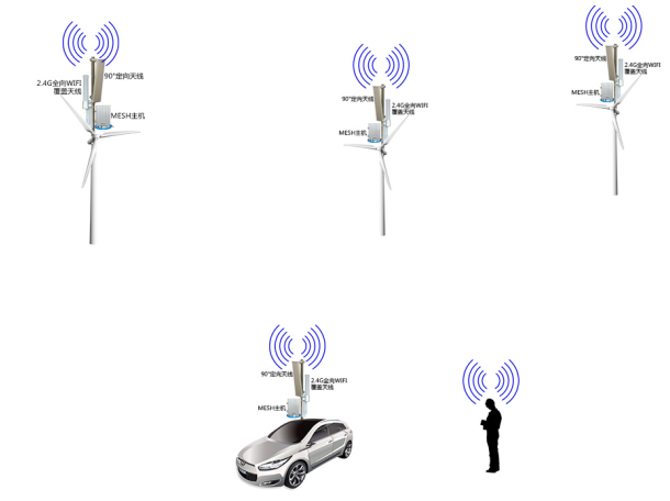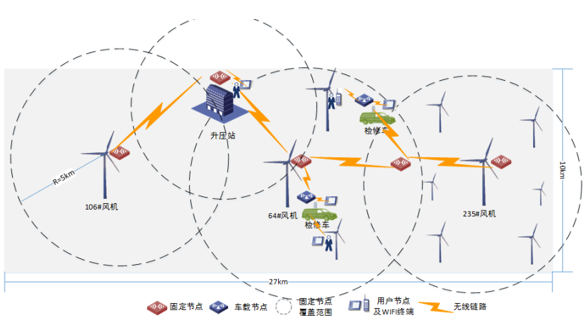 骨干傳輸功能,節(jié)點間可自主形成網(wǎng)狀網(wǎng)絡(luò),并實現(xiàn)大容量數(shù)據(jù)在風(fēng)機間、風(fēng)機與移動車輛間的遠距離、寬帶傳輸;