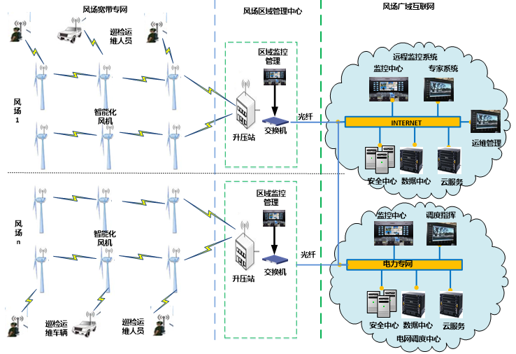 風(fēng)電廠而言,風(fēng)機可能布于各個山頭,非常分散,各個風(fēng)機距離主控室距離均較遠。但風(fēng)機和逆變室 均有移動辦公及移動檢修的聯(lián)網(wǎng)需求,風(fēng)電場對無線的需求尤為突出。怎樣建設(shè)一張網(wǎng)絡(luò)來滿足檢修等信息傳遞是新能源公司要考慮的問題。