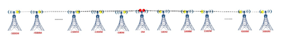 紅色圓點示意HC58C2-17D90基站網(wǎng)橋;黃色圓點示意HC58N2-16I(V3)客戶端網(wǎng)橋;0m處為光纖落地點