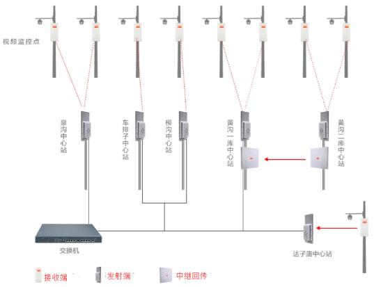 柳溝水庫(kù)周邊有40個(gè)無(wú)線監(jiān)控點(diǎn),而達(dá)子廟的一個(gè)監(jiān)控點(diǎn)距離柳溝水庫(kù)較遠(yuǎn),所以在達(dá)子廟水庫(kù)增加一個(gè)中心站來(lái)保證達(dá)子廟水庫(kù)的監(jiān)控點(diǎn)能正常將視頻數(shù)據(jù)傳回。