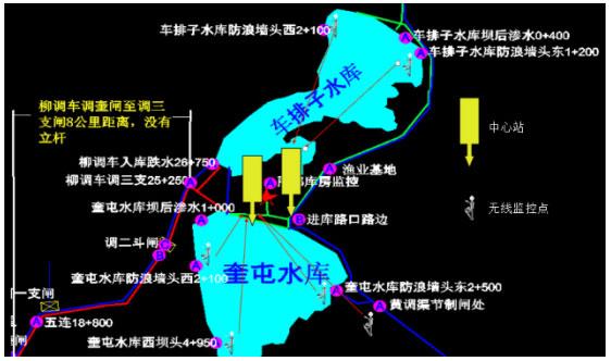 在車(chē)排子水庫(kù)與奎屯水庫(kù)周邊總共有60個(gè)監(jiān)控點(diǎn),設(shè)定兩個(gè)中心站來(lái)保證數(shù)據(jù)傳輸暢通。
