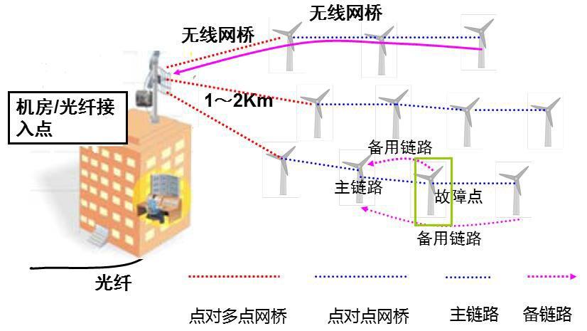 采用多跳MESH網(wǎng)橋無線組網(wǎng),所有風塔的數(shù)據(jù)可以通過無線匯聚到控制中心??刂浦行呐c風機之間采用點對多點模式,風機之間采用MESH自組網(wǎng)模式。采用中訊慧通工業(yè)級11n AP產(chǎn)品,可實現(xiàn)16跳的網(wǎng)橋傳輸,每跳距離大于2km,總性能在40Mbps以上。完全滿足中小型風電場的需求。